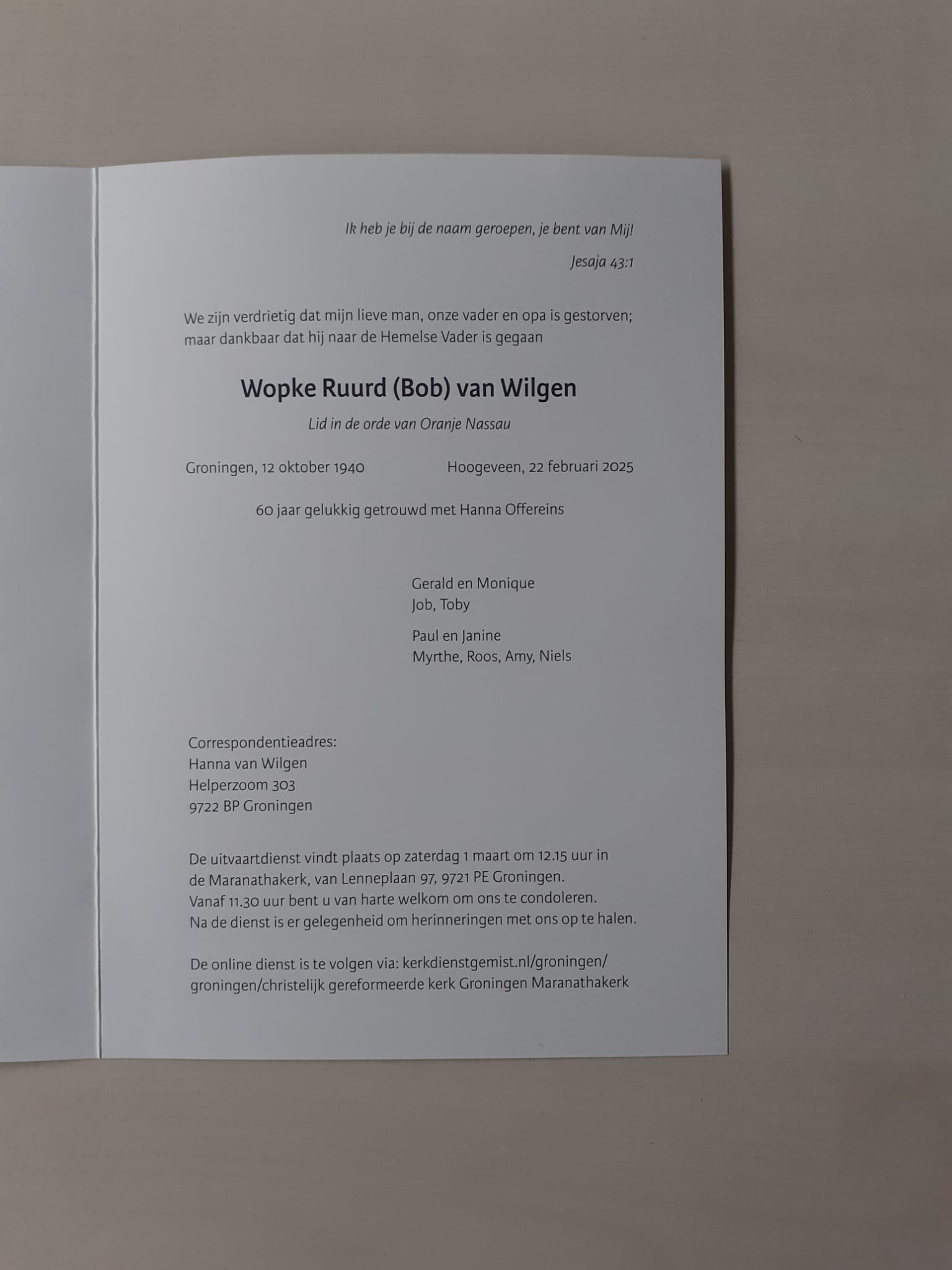 De uitvaartdienst is op zaterdag 1 maart a.s. om 12.15 uur in de Maranathakerk aan de Van Lenneplaan 97 in Groningen. Let erop, dat je daar alleen betaald kunt parkeren. Zoals je op de rouwkaart kunt lezen, is de dienst ook online te volgen.